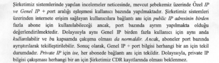 şeklinde olup, IP adreslerinin birden fazla kullanıcı için aynı anda kullanılır olması ve çakışma yaşanmasının normal olduğu ancak aynı IP adresini kullanan kullanıcılara verilen port numarası sayesinde ayrıştırılabilecekleri açıklanmıştır. Bu doğrultuda internet servis sağlayıcıları tarafından CGNAT sistemi kullanılıyor ise söz konusu CGNAT kaydının internet servis sağlayıcısı tarafından detaylı şekilde tutulması gerekmektedir. IP adreslerinin yanı sıra CGNAT sistemi kullanılıyor ise port numarasının da mutlaka internet servis sağlayıcısı tarafından kaydedilmesi gerekir.